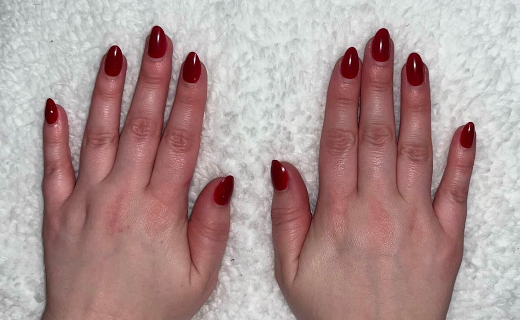 Elegant deep red nail polish on long almond-shaped nails, highlighting a gold ring with sparkling stones.